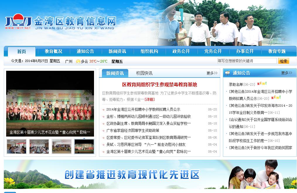 珠海市金灣區(qū)教育信息網(wǎng)(www.jwjy.net)是由金灣區(qū)教育局主辦的教育門戶網(wǎng)站, 是金灣教育在互聯(lián)網(wǎng)上對外展示的窗口,是發(fā)布金灣區(qū)權(quán)威教育信息、公開教育黨務(wù)、政務(wù)信息的重要平臺,是廣大師生、家長和社會公眾了解金灣教育、關(guān)注金灣教育的網(wǎng)絡(luò)媒介。金灣區(qū)教育信息網(wǎng)自2013年7月上線以來,充分整合政府信息資源,實現(xiàn)教育資源教育信息共享,為金灣區(qū)電子政務(wù)乃至珠海市在地區(qū)教育局門戶領(lǐng)域樹立領(lǐng)先形象,極大提高金灣區(qū)在相關(guān)領(lǐng)域的技術(shù)水平和管理服務(wù)理念,成為金灣區(qū)電子政務(wù)的中堅力量,真正做到“全心全意為人民服務(wù)”。