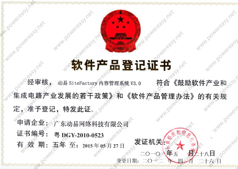 軟件產(chǎn)品登記證書 動(dòng)易SiteFactory內(nèi)容管理系統(tǒng)V3.0