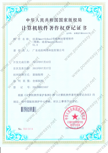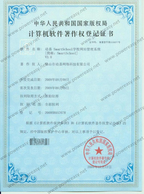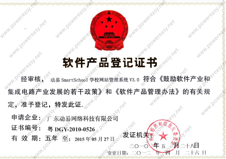 軟件產(chǎn)品登記證書 動(dòng)易SmartSchool學(xué)校網(wǎng)站管理系統(tǒng)V3.0