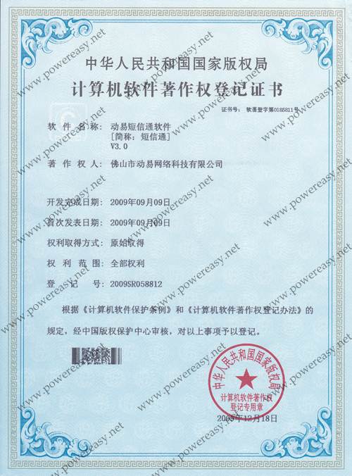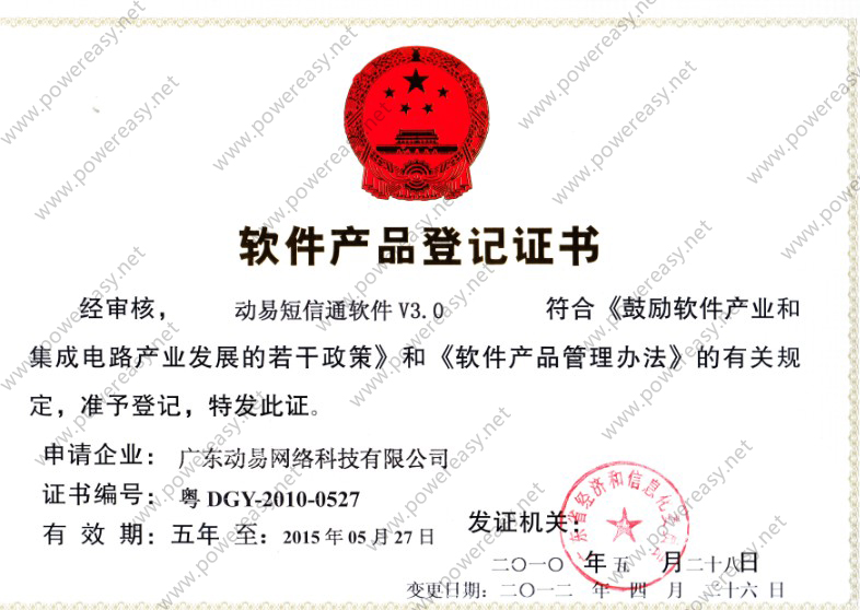 軟件產(chǎn)品登記證書 動(dòng)易短信通軟件V3.0