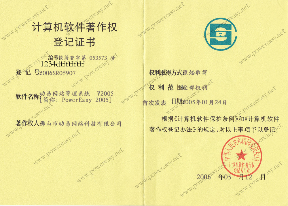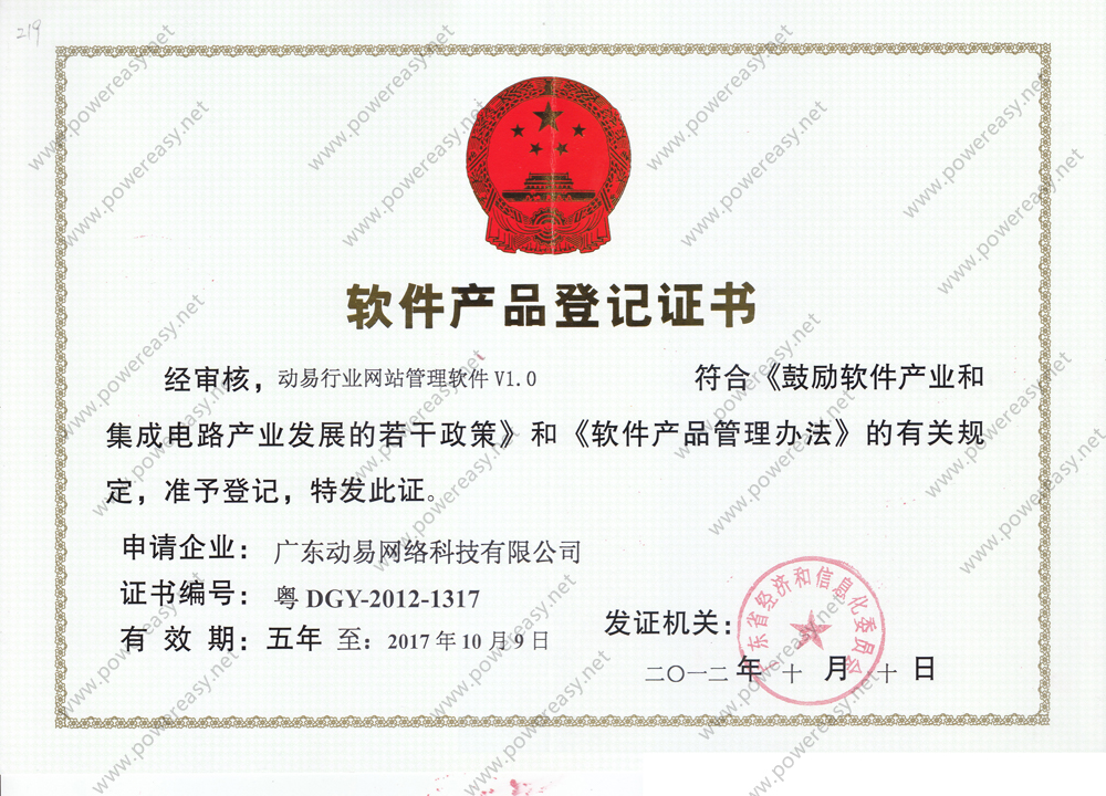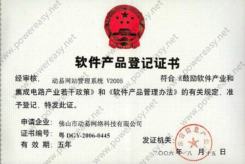 軟件產(chǎn)品登記證書 動(dòng)易網(wǎng)站管理系統(tǒng)V2005