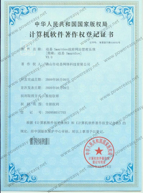 軟件產(chǎn)品登記證書 動(dòng)易SmartGov政府網(wǎng)站管理系統(tǒng)V3.0
