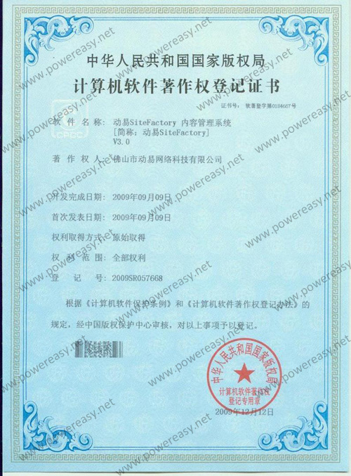 計(jì)算機(jī)軟件著作權(quán)登記證書 動(dòng)易 SiteFactory V3.0