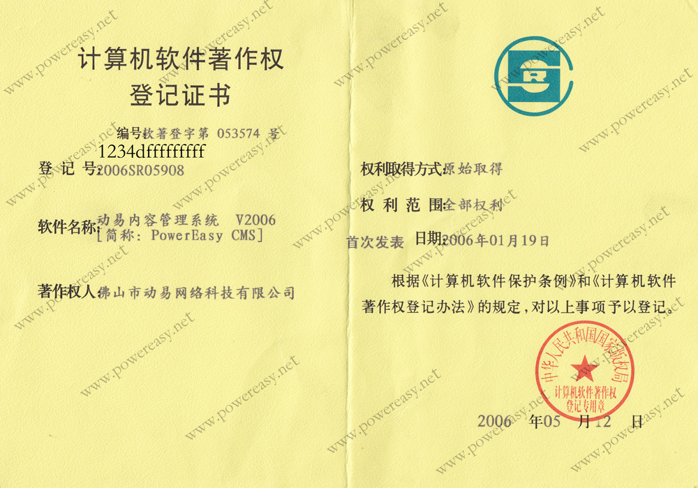 軟件著作權(quán)登記證書 動(dòng)易網(wǎng)站管理系統(tǒng)V2005