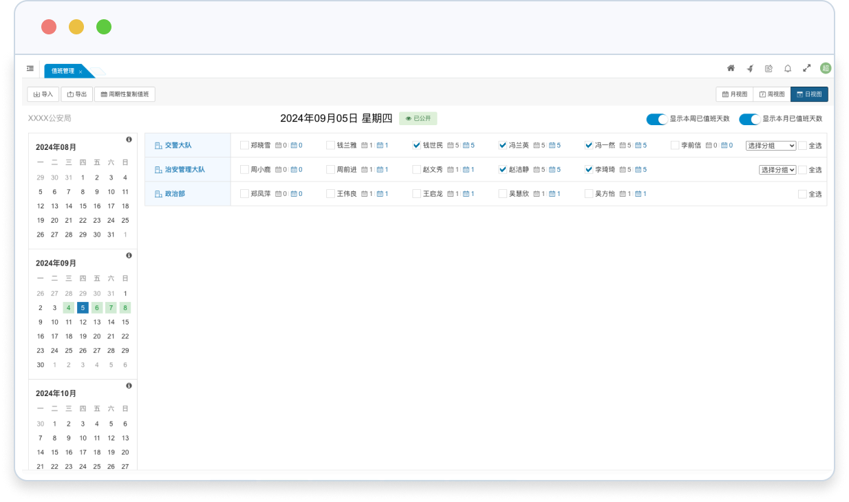- 系統(tǒng)支持多種視圖模式對值班信息進(jìn)行管理,分別是日視圖、月視圖模式和周視圖模式。每種視圖都經(jīng)過精心設(shè)計(jì),旨在盡可能解決客戶排班時(shí)的各種痛點(diǎn)問題。三種視圖模式分別適用于不同值班人員規(guī)模的排班需求:當(dāng)部門少且每天的值班人員較少時(shí),月視圖可以一次性查看更多信息;當(dāng)部門較多但每天安排的人員不多時(shí),周視圖更為合適;當(dāng)部門和成員較多且每天安排的值班人員也很多時(shí),日視圖最適合