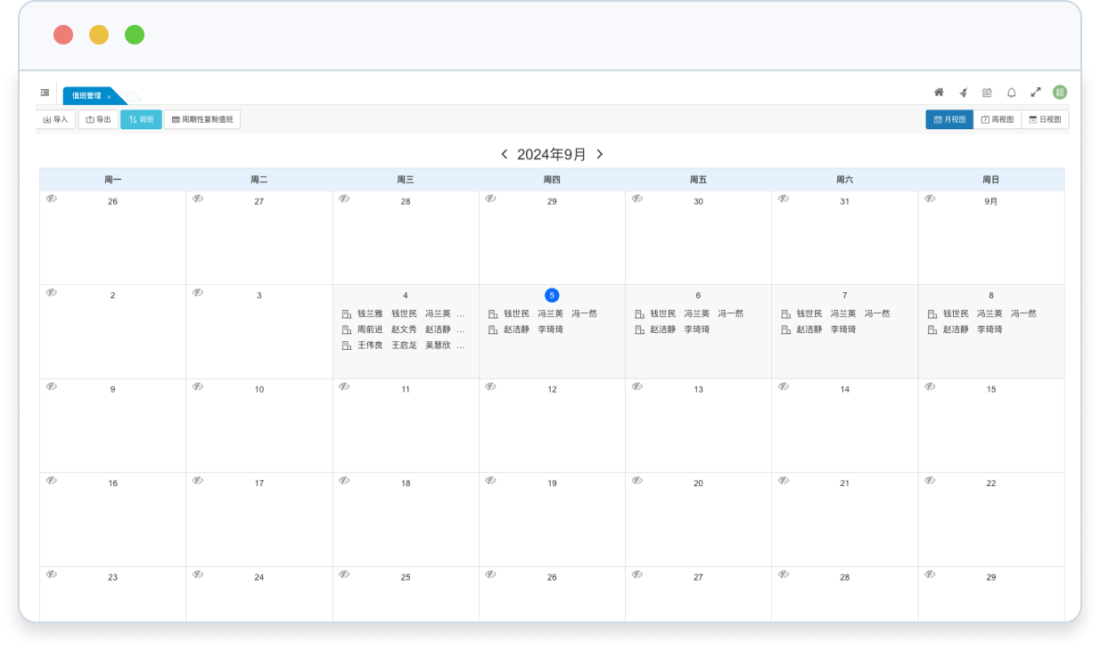 - 支持按日視圖、月視圖模式和周視圖模式對值班信息進(jìn)行管理,不同視圖適用于不同值班人員規(guī)模的排班需求。