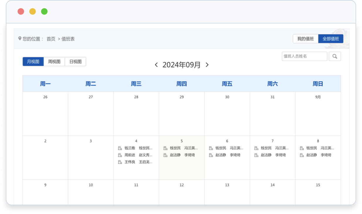 - 值班信息列表頁與后臺(tái)相同,提供月視圖模式來顯示每月的值班信息,提供周視圖模式來展示每周的值班信息,提供日視圖來查看指定日期的值班表,并且支持在月視圖、周視圖、日視圖之間自由切換。用戶還可以從月視圖或周視圖中點(diǎn)擊查看特定日期的值班表,支持按人名搜索值班安排,且能夠同時(shí)搜索多個(gè)人。