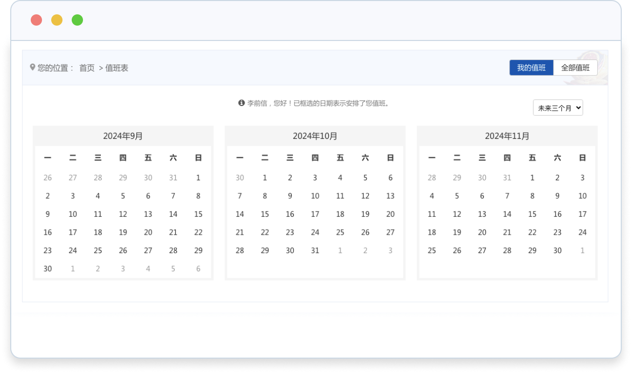 - 支持“我的值班”,當(dāng)用戶已登錄時(shí),可訪問“我的值班”頁面,頁面以日歷方式顯示當(dāng)前用戶的值班安排。