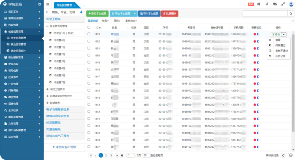 此外,班主任(輔導(dǎo)員)登錄系統(tǒng)后可查看其負責(zé)的班級信息,查看、修改、審核畢業(yè)生的就業(yè)信息。