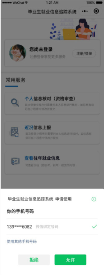 學(xué)?;虬嘀魅卫梦⑿湃旱榷喾N渠道發(fā)布填報通知,畢業(yè)生接獲通知后,通過掃描通知中二維碼快速進入小程序。小程序自動申請獲取當(dāng)前微信賬戶關(guān)聯(lián)的手機號信息,并與畢業(yè)生數(shù)據(jù)庫進行精準(zhǔn)匹配: