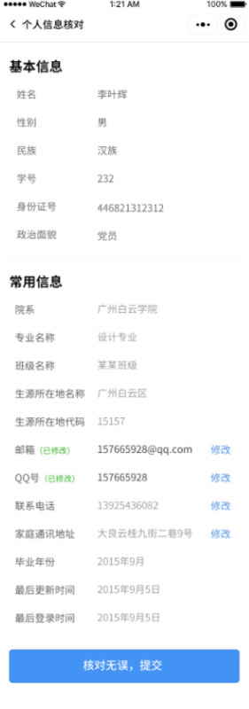 支持畢業(yè)生對本人信息進行核對,如信息有誤可在小程序中修改并提交,院系用戶或輔導(dǎo)員(管理員)將對提交信息進行數(shù)據(jù)審核,系統(tǒng)將自動記錄修改的具體字段及展示修改前后的內(nèi)容對比,以確保數(shù)據(jù)更新的準(zhǔn)確性和可追溯性。