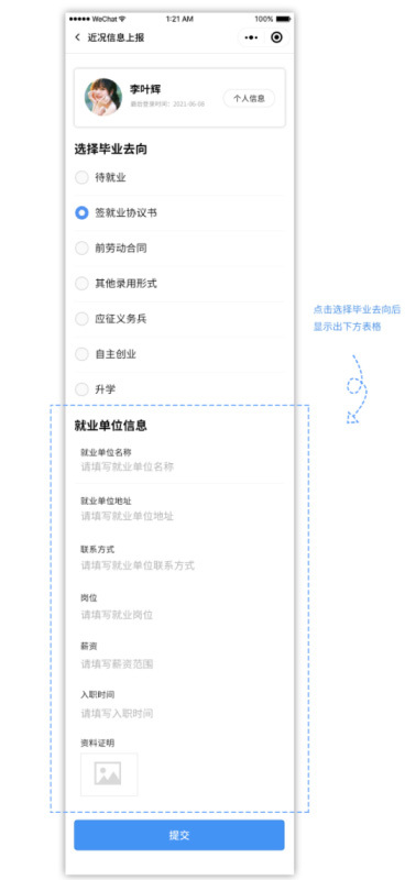 畢業(yè)生根據(jù)自身實際情況,在小程序中選擇當(dāng)前狀態(tài)(待就業(yè)、簽就業(yè)協(xié)議書、簽勞動合同、其他錄用形式、應(yīng)征義務(wù)兵、自主創(chuàng)業(yè)、升學(xué)),小程序根據(jù)所選狀態(tài)提供不同的表單、選項供畢業(yè)生填寫。