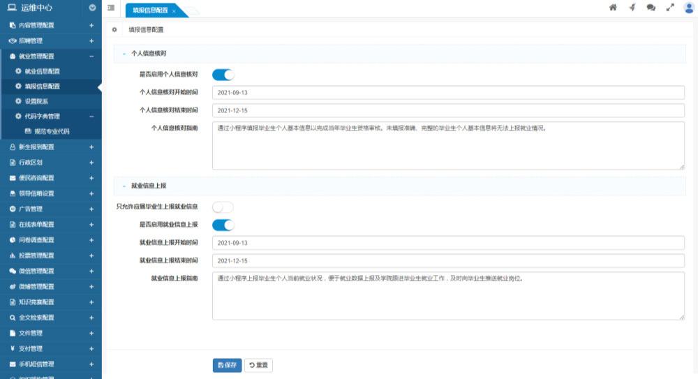 支持設(shè)置是否開放信息上報、信息上報的開始時間、截止時間、信息上報小程序中的指南性文字描述等內(nèi)容。