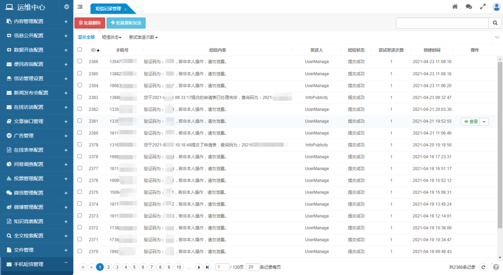 支持對短信發(fā)送記錄進(jìn)行查看、篩選、搜索、刪除等功能,支持對短信進(jìn)行重發(fā)等功能。