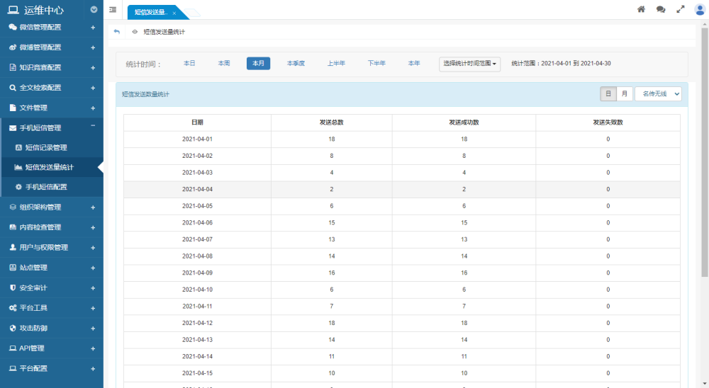 提供按日和按月兩種統(tǒng)計表。統(tǒng)計每日/每月發(fā)送的短信發(fā)送總量、發(fā)送成功數(shù)量、發(fā)送失敗數(shù)量。便于與短信服務(wù)商進(jìn)行對帳。