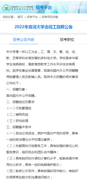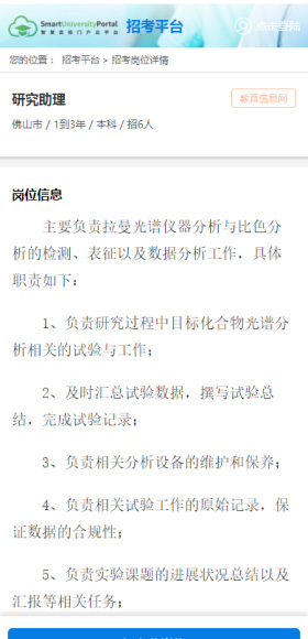 前臺(tái)支持顯示招考項(xiàng)目列表,用戶可以點(diǎn)擊項(xiàng)目名稱查看詳細(xì)信息,并在項(xiàng)目詳情頁(yè)中查看相關(guān)的招聘崗位列表。點(diǎn)擊崗位名稱后,可查看該崗位的詳細(xì)信息。