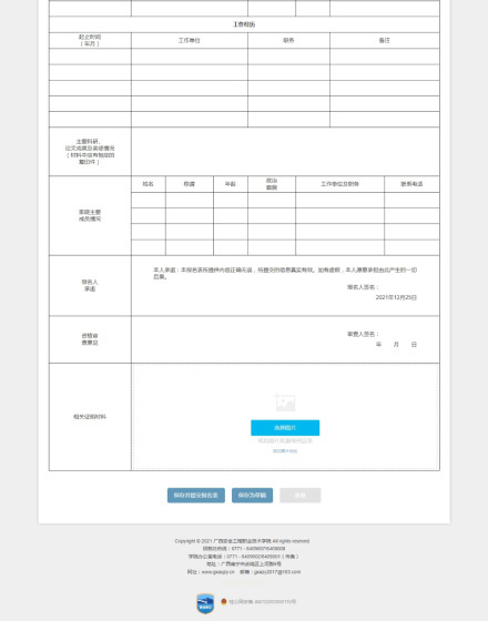 報(bào)名表的填寫(xiě)采用仿真界面,接近紙質(zhì)報(bào)名表的樣式,并支持上傳相關(guān)證明材料(圖片、視頻、PDF、壓縮文件等格式)。