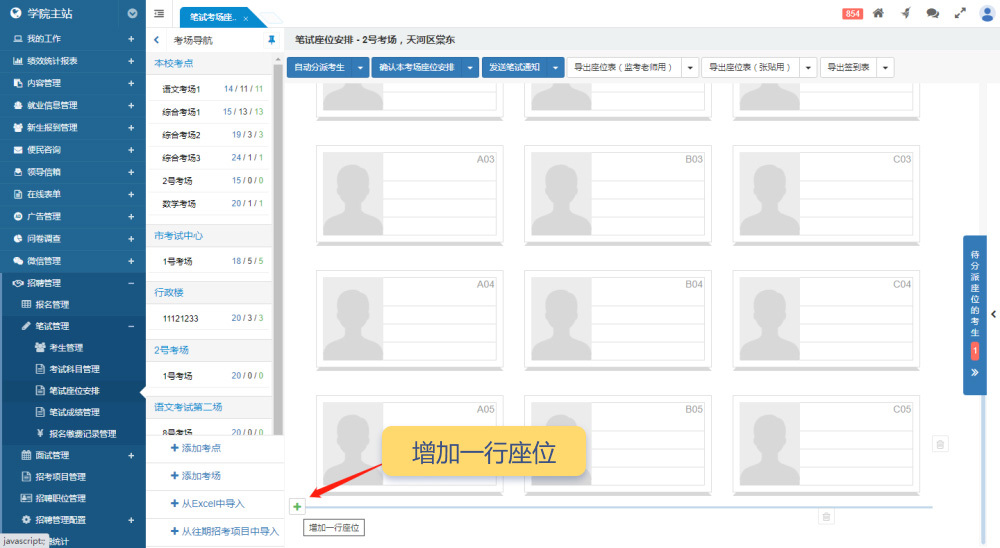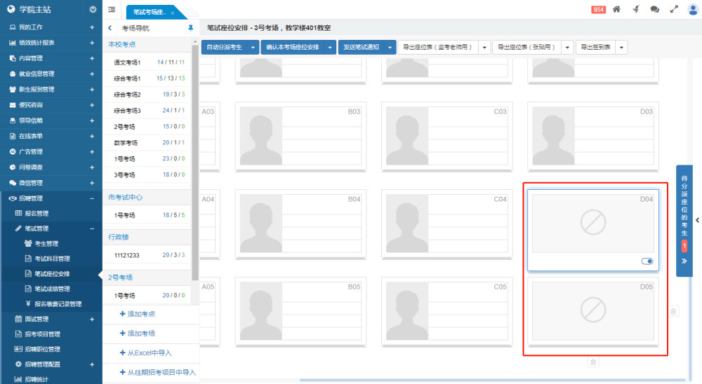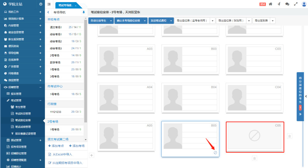 筆試考生管理界面類似于報(bào)名管理界面,中欄顯示本次招考項(xiàng)目的職位列表,每個(gè)職位后面顯示進(jìn)入筆試流程的考生總數(shù)。如果有“待安排座位”的考生,會(huì)有紅點(diǎn)進(jìn)行提醒。中欄頂部支持切換不同的招考項(xiàng)目。
