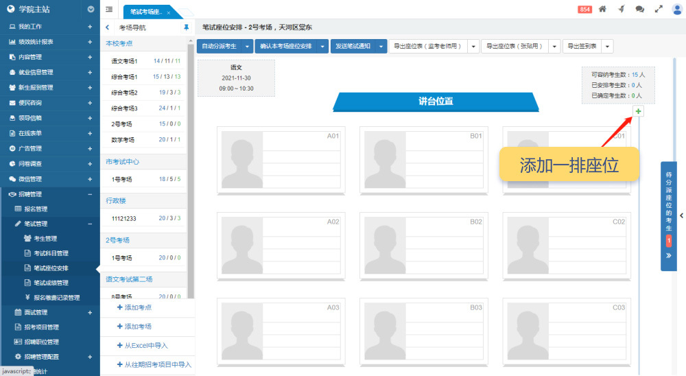 在后臺(tái)管理界面中,中欄顯示考點(diǎn)和考場(chǎng)導(dǎo)航信息。右側(cè)展示座位安排表,以所見(jiàn)即所得的方式顯示每個(gè)座位的考生信息。同時(shí),右側(cè)還包含“待分派座位的考生”區(qū)域(僅在有待分派考生時(shí)顯示)。