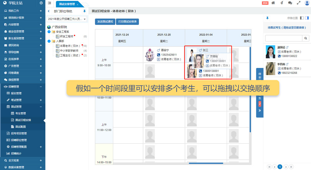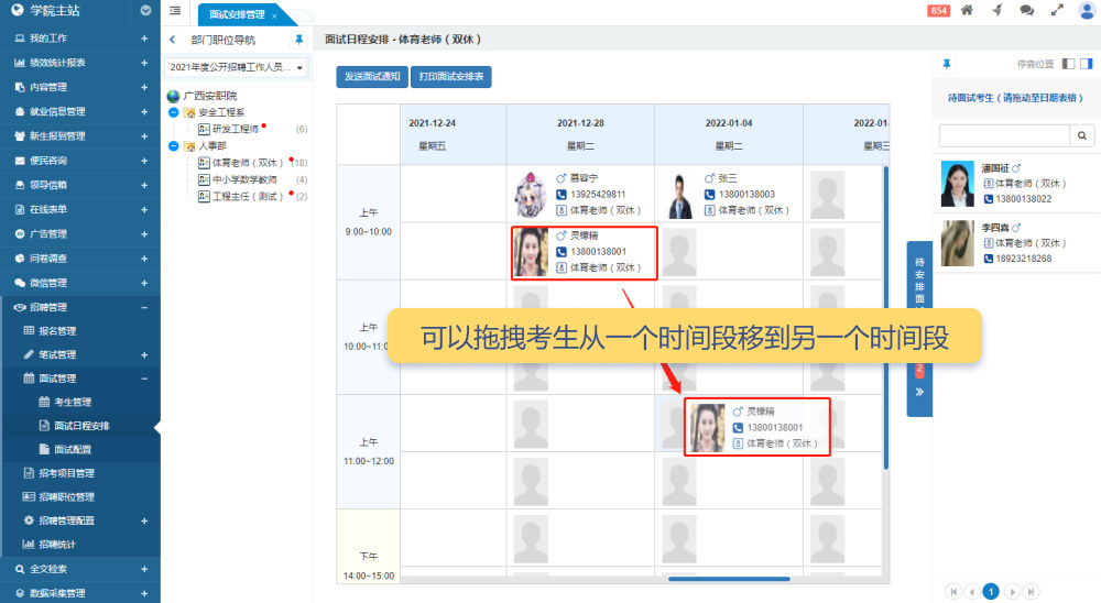 面試日程安排表的列為指定的招聘日期,行為面試時(shí)間段,每個(gè)單元格顯示該時(shí)間段的已安排面試考生及其報(bào)考崗位。點(diǎn)擊左側(cè)的招聘崗位,表格將篩選出該崗位已安排面試的考生;點(diǎn)擊右側(cè)的“待安排考生”,表格則篩選出該考生對(duì)應(yīng)崗位的已安排考生。用戶可以將“待安排考生”拖拽到未安排面試的時(shí)間段,也可以在不同時(shí)間段間拖動(dòng)考生。若一個(gè)時(shí)間段內(nèi)有多個(gè)考生,還可通過(guò)拖拽調(diào)整順序。已安排好的考生可隨時(shí)移除以重新安排。