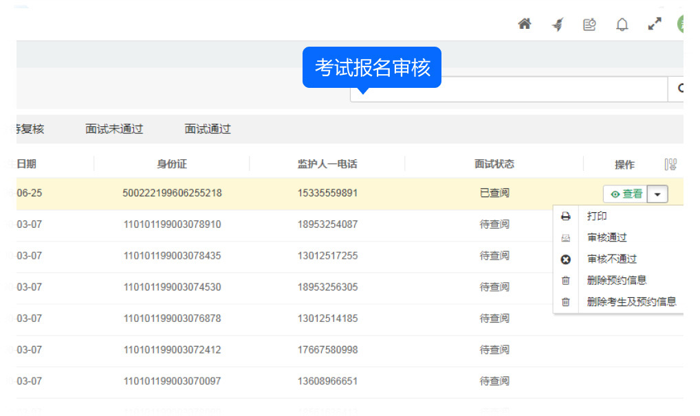 針對(duì)報(bào)名表的處理提供了豐富的操作選項(xiàng),包括查看報(bào)名表、審核通過(guò)、審核不通過(guò)、撤消審核不通過(guò)、打印報(bào)名表、刪除報(bào)名信息、刪除考生及報(bào)名信息等,并支持這些操作的批量處理,極大地提高了工作效率。查看報(bào)名表后自動(dòng)將狀態(tài)改為“已查閱”。
