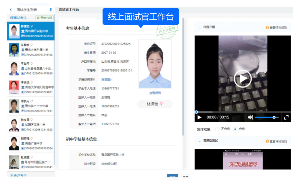 對(duì)于審核通過(guò)的考生,其查看頁(yè)面還會(huì)展示各測(cè)評(píng)項(xiàng)目的視頻上傳信息及測(cè)評(píng)結(jié)果,對(duì)于處于測(cè)評(píng)中狀態(tài)的考生,查看頁(yè)支持“允許考生重新上傳視頻”的功能,而對(duì)于測(cè)評(píng)中及后續(xù)狀態(tài)的考生,查看頁(yè)的測(cè)評(píng)項(xiàng)目還支持“重置測(cè)評(píng)結(jié)果”操作,以應(yīng)對(duì)某些特殊情況下的需求調(diào)整。