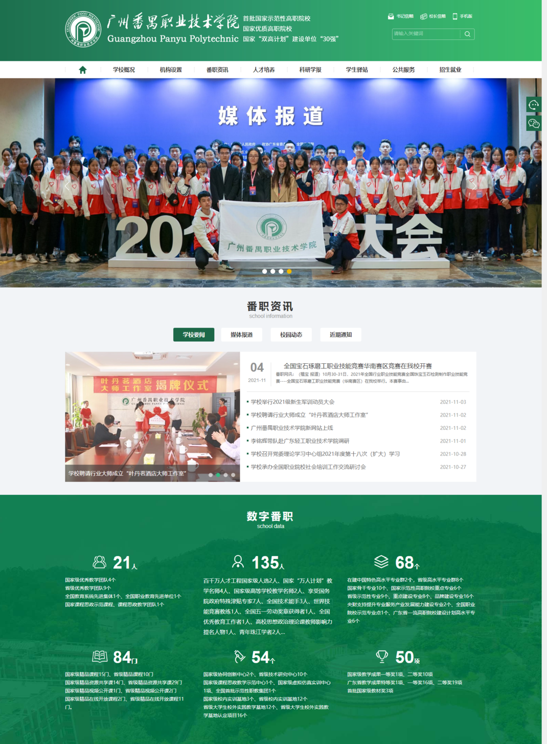 2021年,學(xué)院采用動(dòng)易高校門戶網(wǎng)站建設(shè)解決方案,成功構(gòu)建以學(xué)校門戶網(wǎng)站為主站,各學(xué)院、部門、黨政等40個(gè)二級(jí)部門為子站的“1+40”模式的集約化網(wǎng)站平臺(tái)。