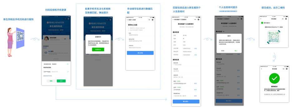 新生掃描小程序碼,進入小程序。小程序自動申請獲取當前微信綁定的手機號,并將手機號與新生報到數(shù)據(jù)進行匹配。匹配成功后,顯示新生院系、專業(yè)、班級、個人信息等信息,新生確認個人信息后,系統(tǒng)生成二維碼。