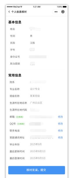 畢業(yè)生對本人信息進行核對,如信息有誤可在小程序中修改并提交,并由院系用戶或輔導員(管理員)進行數(shù)據(jù)審核。