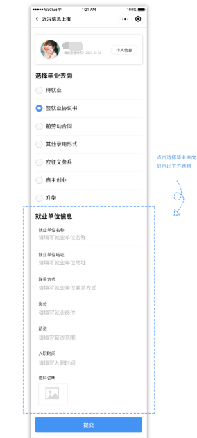 畢業(yè)生根據(jù)本人實際情況,選擇當前狀態(tài)(待就業(yè)、簽就業(yè)協(xié)議書、前勞動合同、其他錄用形式、應征義務兵、自主創(chuàng)業(yè)、升學),小程序按照選擇的不同形態(tài)提供不同的表單、選項供畢業(yè)生填寫。