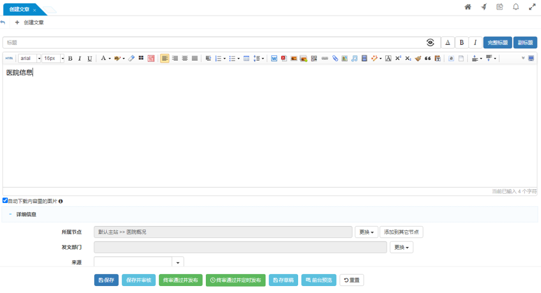 網(wǎng)站后臺(tái)提供對(duì)網(wǎng)站所有信息進(jìn)行添加/刪除、查詢(xún)、搜索、簽收、審核、歸檔、替換、退稿等豐富的信息管理功能,配合強(qiáng)大的后臺(tái)內(nèi)容編輯器,方便醫(yī)院門(mén)戶網(wǎng)站構(gòu)建起強(qiáng)大的內(nèi)容信息及咨詢(xún)管理平臺(tái)。