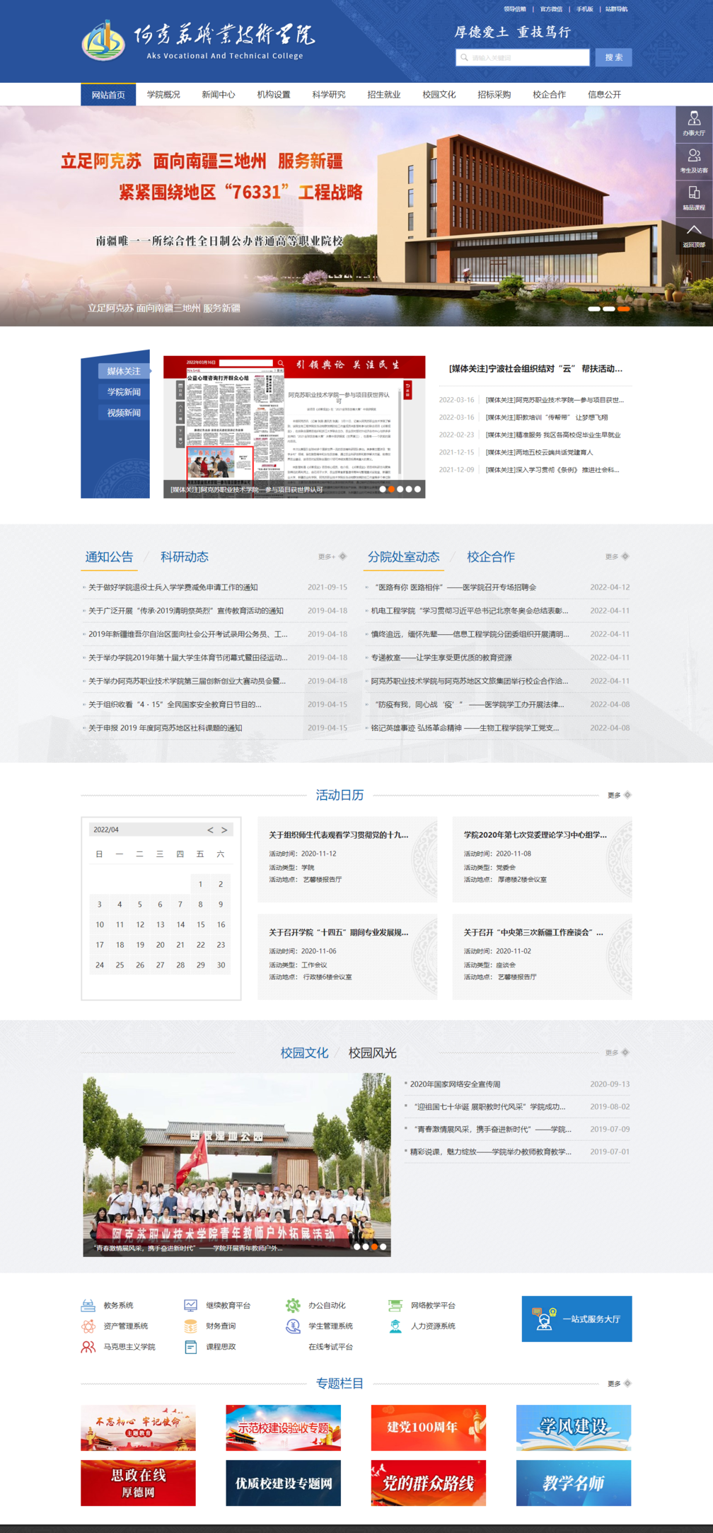 優(yōu)化教學(xué)和管理服務(wù)業(yè)務(wù)流程, 提高網(wǎng)站群平臺的智能運維和安全管理能力,提高學(xué)校教育教學(xué)質(zhì)量和管理水平,推動職業(yè)教育數(shù)字化升級,助力阿克蘇職業(yè)技術(shù)學(xué)院打造區(qū)域性教育人才高地。