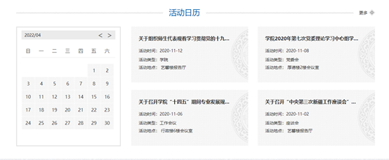 日歷日期鏈接學(xué)院所有活動,以直觀的表現(xiàn)形式介紹活動時間及情況。同時采用時間軸的形式回顧活動,可以讓訪問者快速便捷的訪問以往相關(guān)活動信息。
