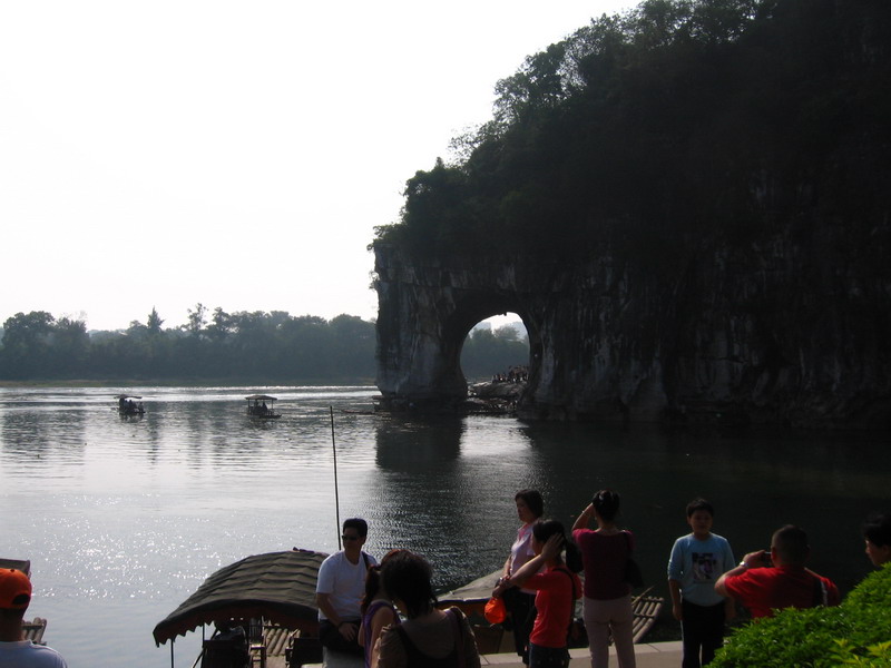 走了不久就見(jiàn)到象鼻山了,還真不減當(dāng)年的氣勢(shì)。由于游人很多,要照到一張沒(méi)有人山合影的還真難呢?這里的游人還有不少的外國(guó)朋友,我注意到他們大部分跟我們這幾個(gè)小伙子一樣自助游噢!漓江的水現(xiàn)在還是清澈見(jiàn)底的,不是很寬也不是很深,站在旁邊看比較淺的地方還能看到水草和鵝卵石。江邊還挺靠著很多竹排和小船還有游船。也有江邊燒烤漓江小魚(yú)的,在強(qiáng)烈的陽(yáng)光下,時(shí)而吹來(lái)了微風(fēng)夾著淡淡的魚(yú)香味直讓人不斷咽口水。大概是怕上火很多游人包括我也沒(méi)敢去嘗試,不過(guò)還是有去試的。還時(shí)不時(shí)的聽(tīng)到一些旅游團(tuán)的導(dǎo)游用喇叭給游客們講解。靜聽(tīng)了一會(huì)就離開(kāi)了,不遠(yuǎn)處有雜技表演。手拋多個(gè)羽毛球拍、小球,還有嘴叼筷子頂氣球及變臉等等。我們先到處轉(zhuǎn)了轉(zhuǎn),照些相片最后決定到象鼻山的象鼻子下站一站。這有水路和陸路都可以到達(dá),暈,一問(wèn)水路的竹排20元,就幾米嘛!所以我們就馬上打算另尋小路過(guò)去,跟著其他游人最后還是到達(dá)了我們想去的地方。還爬了象鼻山,這時(shí)總算把整個(gè)象鼻山公園給游遍了。要不是有這依舊秀美的漓江水和高大的像鼻山,大老遠(yuǎn)跑來(lái)看公園真會(huì)讓人失望的。還照了些相片就離開(kāi)象鼻山了。