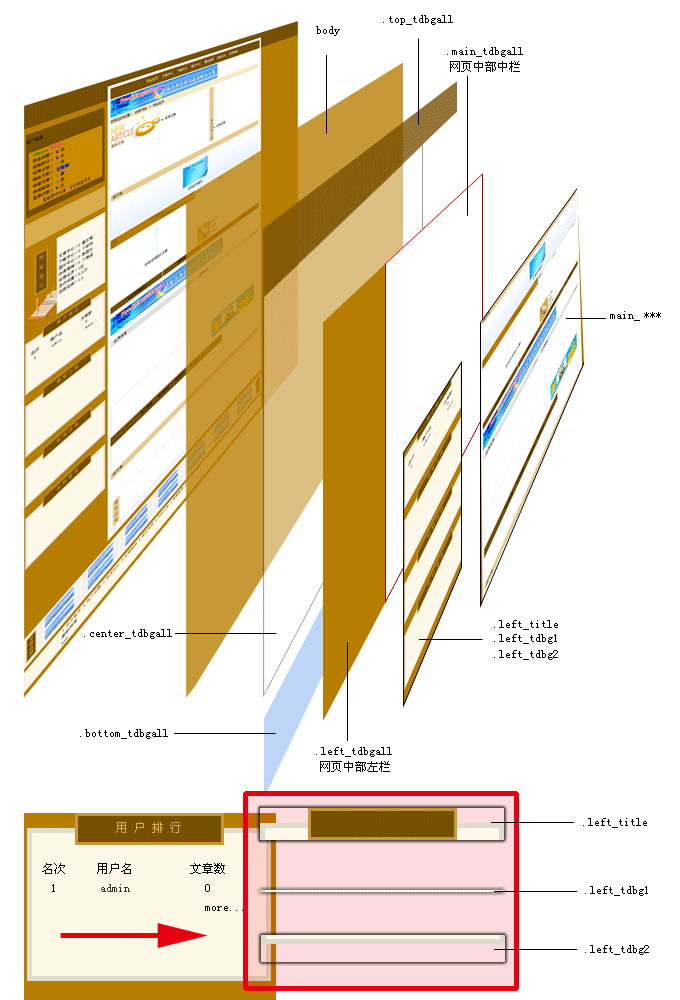 ·網(wǎng)頁(yè)頂部定義的樣式命名為:top_***; 在網(wǎng)頁(yè)中部定義中,按其位置劃分為左、中、右三個(gè)區(qū)塊: |