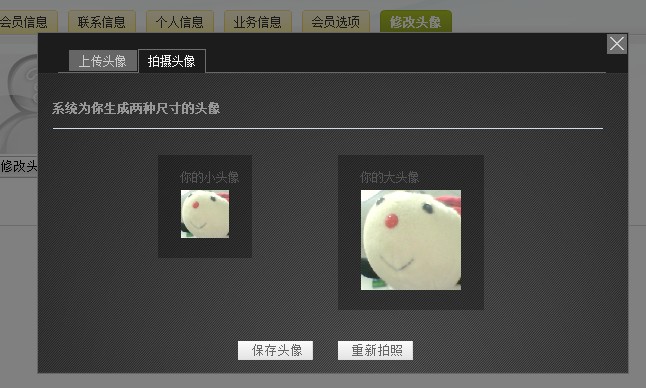 下面我們來看看有趣的頭像應(yīng)用,可以直接在會(huì)員中心首頁點(diǎn)擊頭像進(jìn)入修改頁面,或者在左側(cè)的“修改個(gè)人信息”來實(shí)現(xiàn)。更改頭像有兩種方式,您可以直接上傳頭像,或者使用在線拍攝頭像功能。拍攝完畢后還會(huì)出現(xiàn)圖片剪裁框,根據(jù)取景效果和拍攝質(zhì)量,可以自由調(diào)整畫面尺寸,使得頭像更加“精神”、展示自己的獨(dú)特風(fēng)范。當(dāng)然,如果感覺此次拍攝的質(zhì)量一般,還可選擇“重新拍照”。