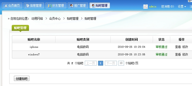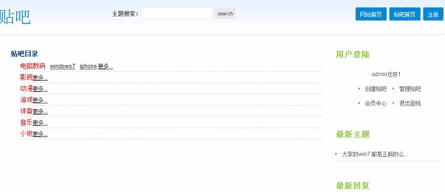 通過以上步驟,后臺配置就完成了,我們在前臺的會員中心看到增加了貼吧管理功能。下面我們來預覽一下效果。