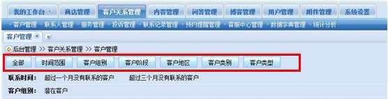 系統(tǒng)后臺(tái)界面客戶管理中,我們可以看到管理列表中有7欄不同的分類(lèi),可以按照時(shí)間范圍、客戶組別、客戶階段、客戶地區(qū)、客戶類(lèi)別、客戶類(lèi)型、全部客戶等條件進(jìn)行客戶搜索。如圖: