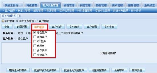 如果您想按客戶組別查找一批客戶資料,那么將鼠標(biāo)停留在“客戶組別”一欄上,功能鍵下方便會(huì)出現(xiàn)相應(yīng)的組別選項(xiàng)“潛在客戶”、“普通客戶”、“VIP客戶”、“代理商”、“合作伙伴”、“失效客戶”,按照需求點(diǎn)擊相應(yīng)的選項(xiàng),便可查詢(xún)到您需要的客戶資料。