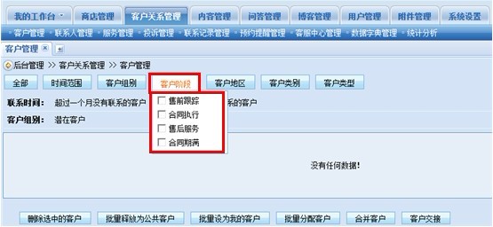 如果您想按客戶階段查找一批客戶資料,那么將鼠標(biāo)停留在“客戶階段”一欄上,功能鍵下方便會(huì)出現(xiàn)相應(yīng)的組別選項(xiàng)“售前跟蹤”、“合同執(zhí)行”、“售后服務(wù)”、“合同期滿”,按照需求點(diǎn)擊相應(yīng)的選項(xiàng),便查詢(xún)到您需要的客戶資料了。