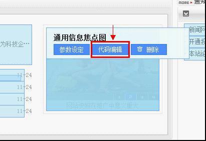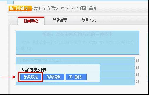 進(jìn)入模板可視塊編輯頁(yè)面,鼠標(biāo)移動(dòng)到需要進(jìn)行修改標(biāo)簽參數(shù)的模塊上,頁(yè)面即出現(xiàn)“代碼編輯”選項(xiàng),點(diǎn)擊出現(xiàn)代碼修改編輯框,修改后可在界面中看到實(shí)際效果。點(diǎn)擊“參數(shù)設(shè)定”選項(xiàng)。