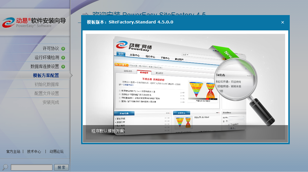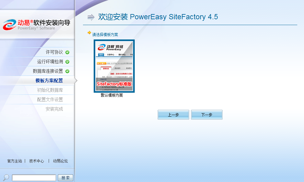 在產(chǎn)品安裝過程中,我們可以看到增加了一步“選擇模板方案”,頁面中顯示出待選的模板方案的首頁效果縮略圖。