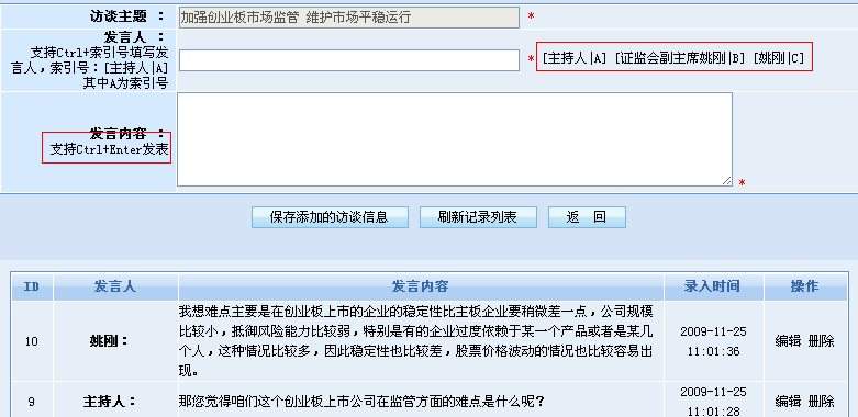 同時(shí),訪談主持人、書(shū)記員或訪談工作人員可以對(duì)網(wǎng)友的提問(wèn)進(jìn)行修改、刪除等多種管理。