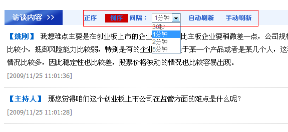 訪談內(nèi)容可以根據(jù)網(wǎng)友的習(xí)慣對(duì)顯示順序、刷新時(shí)間等進(jìn)行設(shè)置,充分適應(yīng)每個(gè)人參與訪談時(shí)的操作習(xí)慣。