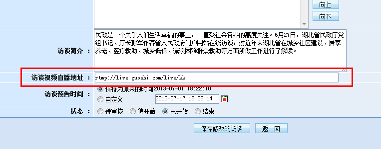隨著政府網(wǎng)站建設(shè)工作的不斷加強(qiáng),目前,在線訪談已經(jīng)成為政府門戶網(wǎng)站互動(dòng)參與程度重要內(nèi)容之一。而隨著Internet網(wǎng)絡(luò)的不斷發(fā)展,網(wǎng)絡(luò)上傳輸?shù)馁Y料不僅僅限于文字和圖形,網(wǎng)絡(luò)視頻成為一種更即時(shí)、真實(shí)、直觀、全面的信息傳播工具,也成為宣傳、公關(guān)、信息傳播的新傳播手段。動(dòng)易SmartGov政府網(wǎng)站管理系統(tǒng)5.0在線訪談新增視頻在線直播功能,支持對(duì)嘉賓訪談現(xiàn)場(chǎng)互動(dòng)情況進(jìn)行網(wǎng)絡(luò)視頻直播和錄像資料的在線播放,只需要填寫(xiě)訪談頁(yè)面上填寫(xiě)訪談視頻直播地址即可。