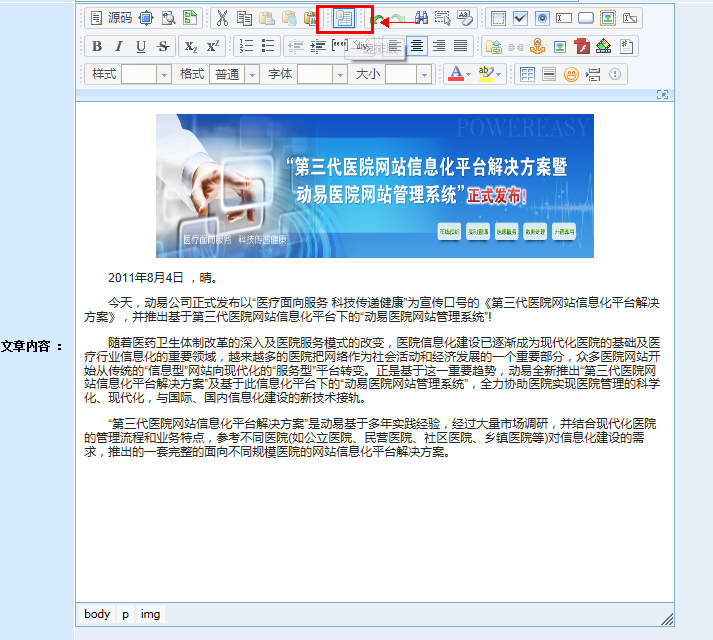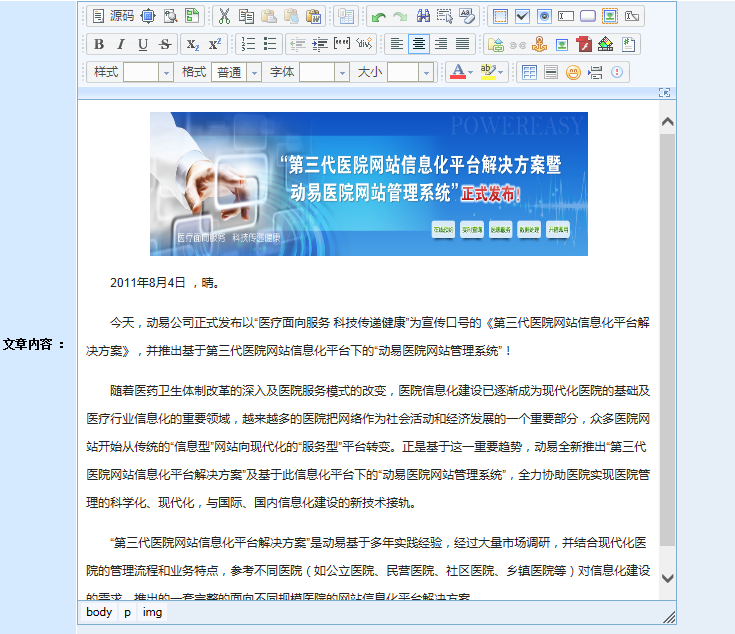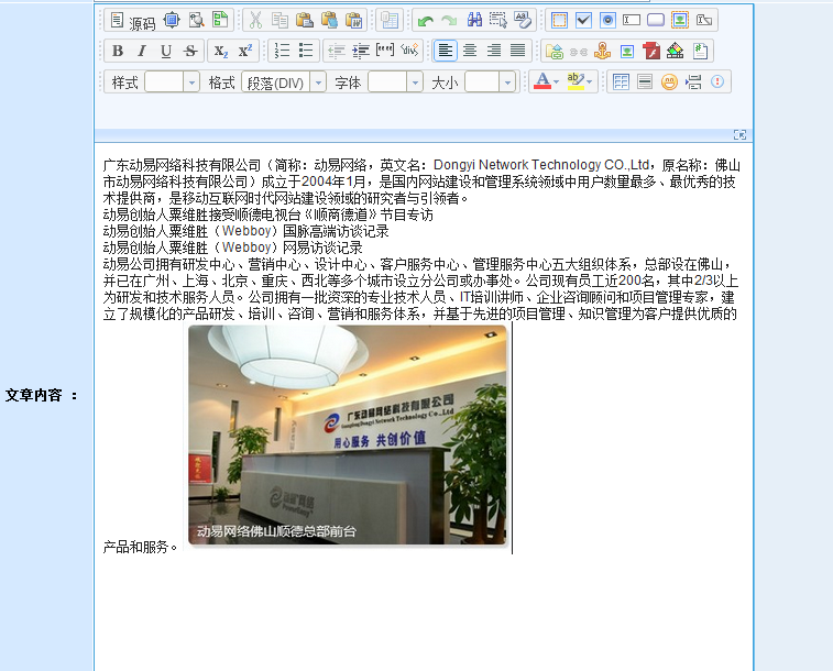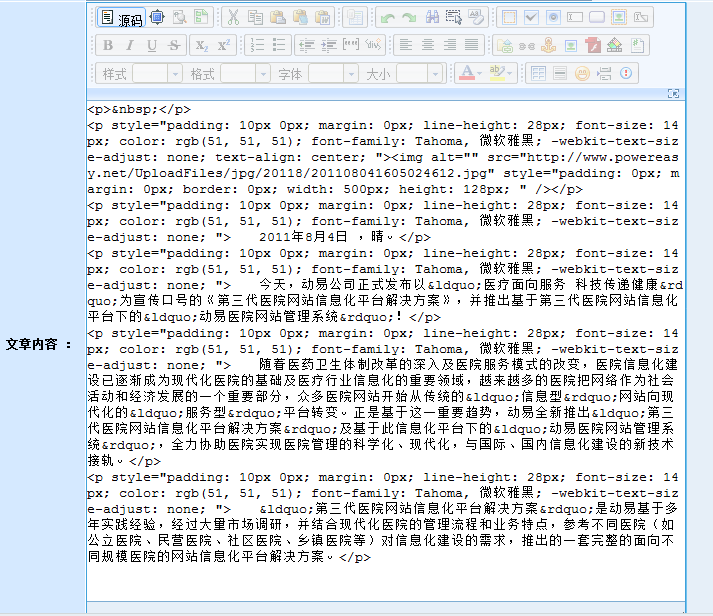 在動(dòng)易后臺(tái),進(jìn)入“添加文章頁面”,在編輯器中輸入文字,添加圖片后,此時(shí)文章無格式: