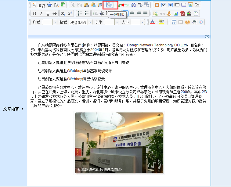 內(nèi)容管理一直是網(wǎng)站管理的核心功能,隨著技術(shù)的不斷進(jìn)步,越來越多的好用功能在為我們管理內(nèi)容提供便捷的服務(wù)。動(dòng)易也在不斷推動(dòng)這些功能的普及,提供了諸如可視化內(nèi)容編輯、圖文排版、流媒體管理、WORD圖片上傳等眾多實(shí)用功能,那么今天我們將要介紹的是另一款新的內(nèi)容編輯利器——一鍵排版。