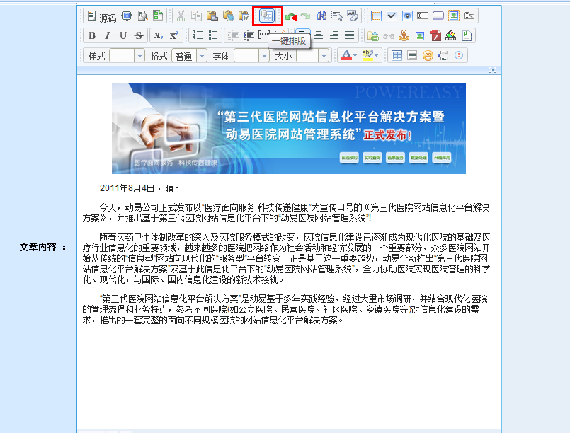 對(duì)于大多數(shù)人來說,日常編輯文章時(shí)常需要在文章的排版上消耗很多時(shí)間。如果你負(fù)責(zé)網(wǎng)站內(nèi)容更新工作則更為頭疼,每天對(duì)著N多需要對(duì)外發(fā)布的新聞,每篇新聞發(fā)布前,都得將文章排版成標(biāo)準(zhǔn)格式,費(fèi)時(shí)費(fèi)力,成為了編輯們“心中不可言喻的痛”。以往在動(dòng)易編輯器中調(diào)整文章格式時(shí),都得一項(xiàng)項(xiàng)手動(dòng)進(jìn)行,頗為費(fèi)時(shí)費(fèi)力,在動(dòng)易5.1版本中,大家利用“一鍵排版”功能將能更加輕松的進(jìn)行內(nèi)容編輯和排版工作?!?/span>一鍵排版”功能可以對(duì)文章進(jìn)行快速自動(dòng)排版功能。只需點(diǎn)擊一下按鈕,就可使之成為合乎規(guī)范和標(biāo)準(zhǔn)的文章格式。如果從word或網(wǎng)頁直接的復(fù)制粘貼文章,“一鍵排版”功能能夠?qū)Ω袷交靵y的文章進(jìn)行整理、編輯和快速排版,排版后的文章會(huì)被剔除所有的樣式,僅以段落為單位進(jìn)行排列,使文章結(jié)構(gòu)更加清晰,內(nèi)容更加干凈和整潔。