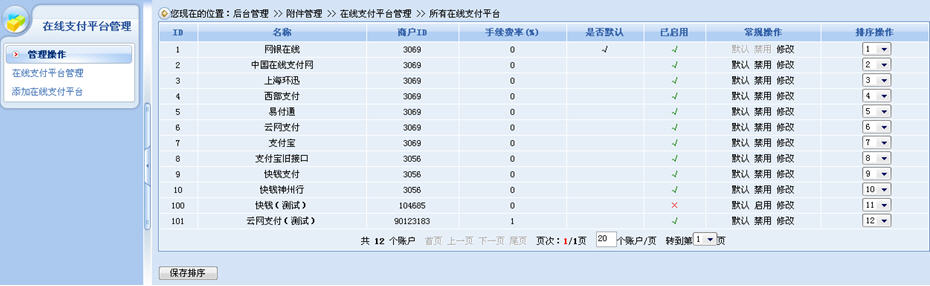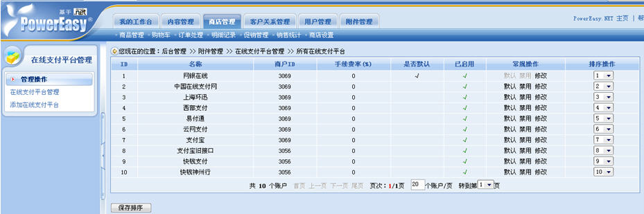 在動易eShop2007里,系統(tǒng)可添加的支付平臺數(shù)量是沒有上限的,網(wǎng)店可以任意添加多個支付平臺。此外,我們還可對支付平臺的先后順序進行排序管理。