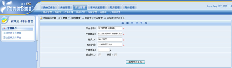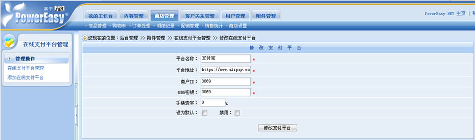 操作步驟:后臺——商店管理——商店設置——在線支付平臺管理。在這里,商家可以自由地添加、禁用、修改以及設置默認的在線支付平臺,而且修改與設置默認的操作非常簡單。
